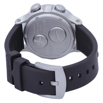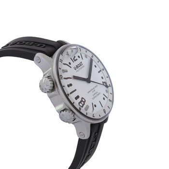 Silver-tone stainless steel case with a black rubber strap. Bi-directional rotating silver-tone stainless steel bezel. White dial with black hands and Arabic numeral & index hour markers. Dial Type: Analog. Quartz movement. Scratch resistant sapphire crystal. Solid case back. Round case shape, case size: 45 mm. Buckle clasp. Water resistant at 100 meters / 330 feet. Functions: hour, minute, second. Capsoil Doppiotempo Series. Casual watch style. U-Boat Capsoil Doppiotempo Quartz White Dial Men's Watch 8888.