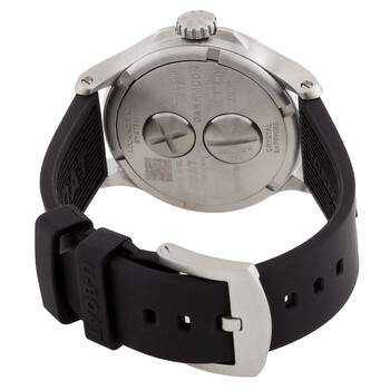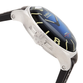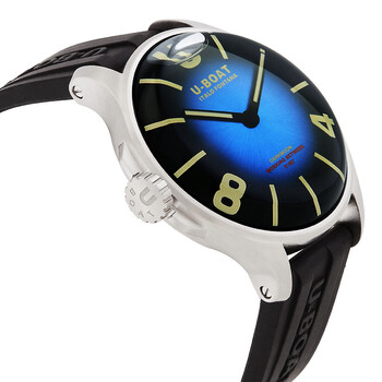 Black PVD stainless steel case with a black rubber strap. Fixed black PVD bezel. Blue dial with luminous black hands and index hour markers. Arabic numerals appear at the 4 and 8 o'clock position. Minute markers around the outer rim. Dial Type: Analog. Luminescent hands and markers. Quartz movement. Scratch resistant sapphire crystal. Screw down crown. Solid case back. Round case shape. Case size: 44 mm. Tang clasp. Water resistant at 50 meters / 165 feet. Functions: hour, minute, second. Darkmoon Series. Casual watch style. U-Boat Darkmoon Quartz Blue Dial Men's Watch 8704.
