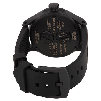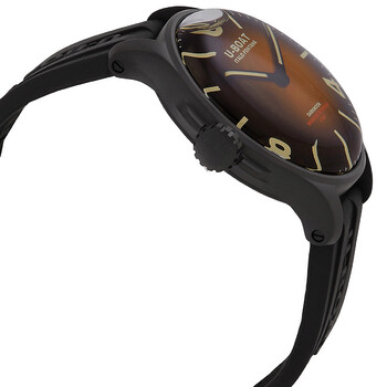Black stainless steel case with a black rubber strap. Fixed black stainless steel bezel. Brown dial with black hands and Arabic numeral & index hour markers. Minute markers around the outer rim. Dial Type: Analog. Luminescent hands and markers. Quartz movement. Scratch resistant sapphire crystal. Solid case back. Round case shape, case size: 44 mm. Buckle clasp. Water resistant at 50 meters / 165 feet. Functions: hour, minute, second. Darkmoon Series. Casual watch style. U-Boat Darkmoon Quartz Brown Dial Men's Watch 8699.