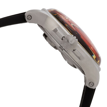 Black-plated stainless steel case with a black rubber strap. Fixed black-plated bezel. Red dial with luminous black hands and index hour markers. Arabic numerals appear at the 4, 8 and 12 o'clock positions. Minute markers around the outer rim. Dial Type: Analog. Luminescent hands and markers. Quartz movement. Scratch resistant sapphire crystal. Screw down crown. Solid case back. Round case shape. Case size: 44 mm. Band width: 22 mm. Tang clasp. Water resistant at 50 meters / 165 feet. Functions: hour, minute, second. Darkmoon Series. Casual watch style. U-Boat Darkmoon Quartz Red Dial Men's Watch 8701.