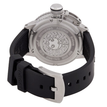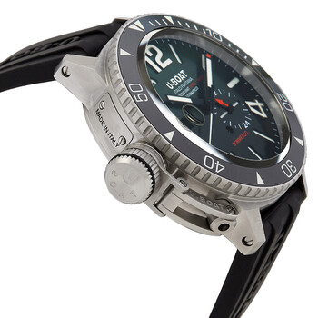 Silver-tone stainless steel case with a black rubber strap. Black stainless steel bezel. Green dial with black hands and Arabic numeral & index hour markers. Minute markers around the outer rim. Dial Type: Analog. Date display at the 9 o'clock position. Automatic movement. Scratch resistant sapphire crystal. Screw down crown. Solid case back. Round case shape, case size: 46 mm. Water resistant at 300 meters / 1000 feet. Functions: date, hour, minute, second. Sommerso Series. Dive watch style. U-Boat Sommerso Automatic Green Dial Men's Watch 9520.