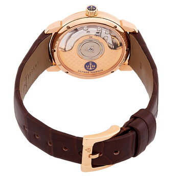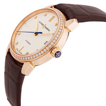 18kt rose gold case with a brown leather strap. Fixed rose gold bezel with diamond set. Off white dial with rose gold-tone with blue second hand hands and diamond with indexes at 6,9 and 12 o'clock position hour markers. Eggshel dial with 8 diamond hour markers. Dial Type: Analog. Luminescent hands and markers. Date display at 3 o'clock position. Caliber UN-810 automatic movement. Scratch resistant sapphire crystal. Pull / push crown. Transparent see through case back. Round case shape, case size: 31 mm. Tang clasp. Water resistant at 30 meters / 100 feet. Functions: date, hour, minute, second. Dress watch style. Ulysse Nardin Automatic Diamond Ladies Watch 8102-116B-2/990.