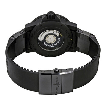 Black rubber coated stainless steel case with a black rubber strap with black ceramic accents. Uni-directional rotating black rubber coated bezel. Black (wave design) dial with rose gold skeleton with luminous fill hands and index hour markers. Minute markers around the outer rim. Dial Type: Analog. Luminescent hands and markers. Date display at the 6 o'clock position. Two sub-dials displaying: seconds and date. Linea power reserve. Automatic movement with a 42-hour power reserve. Scratch resistant sapphire crystal. Screw down crown. Transparent case back. Case diameter: 45.8 mm. Case thickness: 14.8 mm. Round case shape. Band width: 20.3 mm. Band length: 8 inches. Fold over clasp with a push button release. Water resistant at 100 meters / 330 feet. Functions: chronograph, date, hour, minute, second. Casual watch style. Watch label: Swiss Made. Ulysse Nardin Black Sea Automatic Chronograph Black Dial Black Rubber Men's Watch 263-92LE-3C-928.