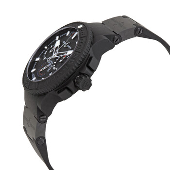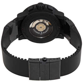 Black (rubber covered) stainless steel case with a black rubber strap with integrated black ceramic inserts. Uni-directional rotating black (rubber covered) bezel. Black dial with luminous silver-tone hands and index hour markers. Minute markers around the outer rim. Dial Type: Analog. Luminescent hands and markers. Date display between the 4 and 5 o'clock positions. Chronograph - three sub-dials displaying: 60 second, 30 minute and 12 hour. Ulysse Nardin calibre UN-35 automatic movement, based upon ETA 2892-A2, containing 57 Jewels, bitting at 28800 vph, and has a power reserve of approximately 42 hours. Scratch resistant sapphire crystal. Screw down crown. Transparent case back. Round case shape. Case size: 45.8 mm. Case thickness: 16.4 mm. Band width: 22 mm. Deployment clasp with a push button release. Water resistant at 200 meters / 660 feet. Functions: chronograph, date, hour, minute, second. Black Sea Chronograph Series. Sport watch style. Watch label: Swiss Made. Item Variations: 353 92 3C, 353.92.3C, 353923C. Ulysse Nardin Black Sea Chronograph Black Dial Black Rubber Men's Watch 353-92-3C.