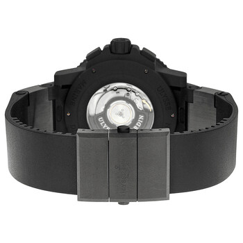 Stainless steel case coated in vulcanized rubber with a black rubber strap with black titanium inserts. Uni-directional rotating stainless steel bezel coated in vulcanized rubber. Black dial with luminmous skeleton hands and index hour markers. Minute markers around the outer rim. Dial Type: Analog. Luminescent hands and markers. Date display between the 4 and 5 o'clock positions. Three sub-dials displaying: 60 second and 30 minute and power reserve indicator. Ulysse Nardin calibre UN-26 automatic movement, containing 28 Jewels, bitting at 28800 vph, and has a power reserve of approximately 42 hours. Scratch resistant sapphire crystal. Screw down crown. Skeleton case back. Round case shape. Case size: 45.8 mm. Case thickness: 14.6 mm. Deployment clasp. Water resistant at 100 meters / 330 feet. Functions: date, hour, minute, second, power reserve indicator, chronometer. Black Sea Series. Luxury watch style. Watch label: Swiss Made. Item Variations: 353 90 3C, 353.90.3C, 353903C. Ulysse Nardin Black Sea Chronograph Watch 353-90-3C.