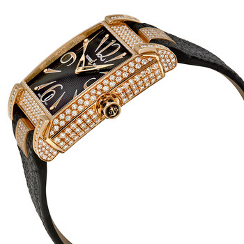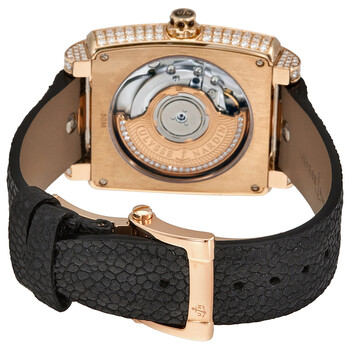 18kt rose gold case with a black galusha strap. Diamond-set lugs. Fixed 18kt rose gold set with diamonds bezel. Black dial with rose gold-tone hands and diamond-tipped index hour markers. Arabic numerals mark the 3, 6, 9 and 12 o'clock positions. Dial Type: Analog. Luminescent hands and markers. Date display at the 6 o'clock position. Ulysse Nardin calibre UN-13 automatic movement with a 42-hour power reserve. Scratch resistant sapphire crystal. Pull / push crown. Transparent case back. Case size: 35.4 mm x 34 mm. Case thickness: 9.5 mm. Rectangle case shape. Band width: 18 mm. Hidden fold over clasp. Water resistant at 50 meters / 165 feet. Functions: date, hour, minute, second. Dress watch style. Watch label: Swiss Made. Item Variations: 136 91FC 06 02, 136.91FC.06.02, 13691FC0602. Ulysse Nardin Caprice Automatic Black Dial Galusha Ladies Watch 136-91FC-06-02.