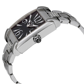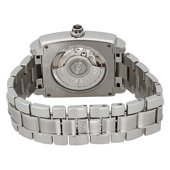 Stainless steel case with a stainless steel bracelet set with diamonds. Fixed stainless steel bezel. Black dial with luminous skeleton hands and index / diamond hour markers. Dial Type: Analog. Luminescent hands and markers. Date display at the 6 o'clock position. Automatic movement. Scratch resistant sapphire crystal. Pull / push crown. Transparent case back. Case dimensions: 34 mm x 35.4 mm. Case thickness: 9.5 mm. Rectangle case shape. Band width: 34 mm. Band length: 7 inches. Hidden fold over clasp. Water resistant at 50 meters / 165 feet. Luxury watch style. Ulysse Nardin Caprice Automatic Black Dial Stainless Steel Ladies Watch 133917C-0602.