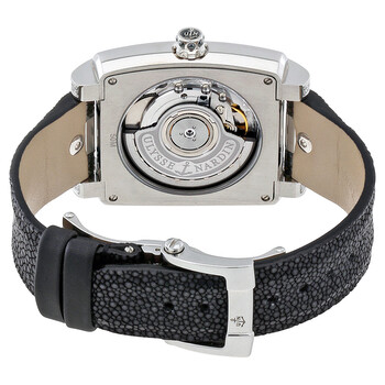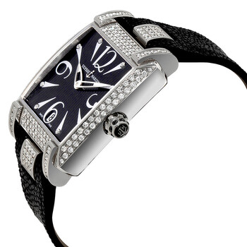 Stainless steel case with a black stingray leather strap. Fixed stainless steel diamond-set bezel. Black dial with luminous silver-tone hands and diamond-tipped index hour markers. Arabic numerals mark the 3, 6, 9 and 12 o'clock positions. Dial Type: Analog. Luminescent hands. Date display at the 6 o'clock position. Ulysse Nardin calibre UN-13 automatic movement with a 42-hour power reserve. Scratch resistant sapphire crystal. Transparent case back. Case dimensions: 34 mm x 35.4 mm. Case thickness: 9.5 mm. Rectangle case shape. Hidden fold over clasp. Water resistant at 50 meters / 165 feet. Functions: date, hour, minute, second. Dress watch style. Watch label: Swiss Made. Item Variations: 133 91AC 06 02, 133.91AC.06.02, 13391AC0602. Ulysse Nardin Caprice Automatic Black Dial Stingray Ladies Watch 133-91AC-06-02.