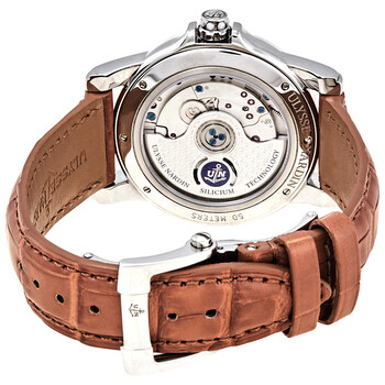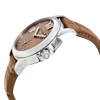 Stainless steel case with a brown alligator leather strap. Fixed bezel. Brown sunray dial with silver-tone hands and diamonds hour markers. Dial Type: Analog. Dual date. One- 60 seconds. UN-334 automatic movement. Scratch resistant sapphire crystal. Screw down crown. Case size: 37.5 mm. Round case shape. Water resistant at 50 meters / 165 feet. Functions: date, hour, minute, second. Additional Info: dial set with 32 diamonds. Luxury watch style. Watch label: Swiss Made. Ulysse Nardin Classic Automatic Ladies Watch 3343-222/30-09.