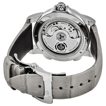 Stainless steel case with a grey (alligator) leather strap. Fixed stainless steel bezel set with 60 diamonds. Silver grey dial with silver-tone hands and diamond hour markers. Dial Type: Analog. Date display at the 2 o'clock position. GMT dual time zone window at the 9 o'clock position. Two displays showing: small seconds and power reserve. Ulysse Nardin calibre UN-324 automatic movement with a 48-hour power reserve. Scratch resistant sapphire crystal. Screw down crown. Transparent case back. Round case shape. Case size: 37.5 mm. Fold over clasp. Water resistant at 50 meters / 165 feet. Functions: date, hour, minute, second, GMT second time zone. Luxury watch style. Watch label: Swiss Made. Ulysse Nardin Classic Lady Dual Time Automatic Diamond Ladies Watch 3243-222B/91.