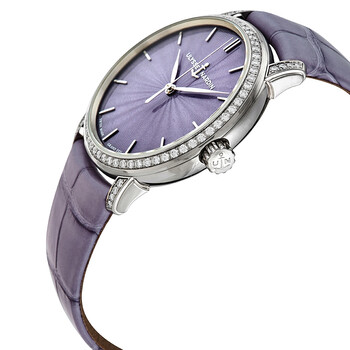 18kt white gold case with a purple crocodile leather strap. Fixed 18kt white gold diamond set bezel. Purple dial with white leaf-style shape hands and index hour markers. Dial Type: Analog. Ulysse Nardin Calibre UN-815 Automatic movement, based upon ETA 2892-A2, containing 25 Jewels, bitting at 28800 vph, and has a power reserve of approximately 42 hours. Scratch resistant sapphire crystal. Pull / push crown. Solid case back. Round case shape. Case size: 37 mm. Buckle clasp. Water resistant at 30 meters / 100 feet. Functions: hour, minute, second. Dress watch style. Watch label: Swiss Made. Ulysse Nardin CLASSICO LADY Diamond Purple Dial Ladies Watch 8150-201BC/E7.