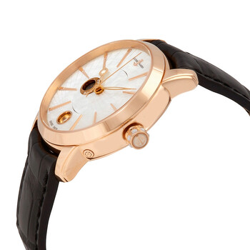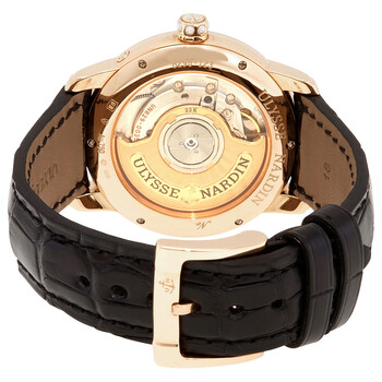 18kt rose gold case with a black leather strap. Fixed bezel. White mother of pearl dial with rose gold-tone hands and index hour markers. Dial Type: Analog. Date display at the 6 o'clock position. Ulysse Nardin Calibre UN-829 automatic movement with a 42-hour power reserve. Scratch resistant sapphire crystal. Pull / push crown. Round case shape. Case size: 35 mm. Water resistant at 50 meters / 165 feet. Functions: moonphase, date, hour, minute, second. Luxury watch style. Watch label: Swiss Made. Ulysse Nardin Classico Lady Luna Automatic White Mother of Pearl Dial Ladies Watch 8296-123-2/91.