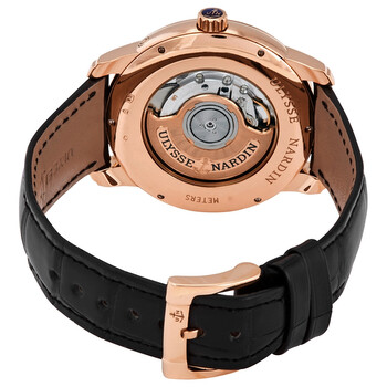 18kt rose gold case with a black alligator leather strap. Fixed bezel. Black dial with rose gold-tone hands. Dial Type: Analog. Luminescent hands and markers. Date display at the 6 o'clock position. Automatic movement. Scratch resistant sapphire crystal. Skeleton transparent exhibition see through case back. Case diameter: 40 mm. Round case shape. Buckle clasp. Water resistant at 50 meters / 165 feet. Functions: date, hour, minute, second. Dress watch style. Watch label: Swiss Made. Ulysse Nardin Classico Luna Black Dial Alligator Leather Automatic Men's Watch 8296-122-2-42.