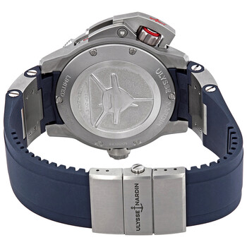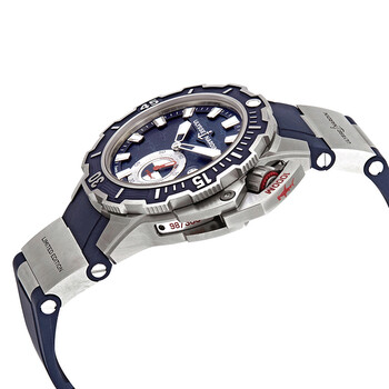 Grey titanium case with a blue rubber strap. Uni-directional rotating grey titanium with a blue rubber inlay bezel. Blue dial with luminous silver-tone hands and index hour markers. Minute markers around the outer rim. Dial Type: Analog. Luminescent hands and markers. Date display at the 3 o'clock position. Seconds subdials. Ulysse Nardin Caliber UN-320 automatic movement with a 48-hour power reserve. Scratch resistant sapphire crystal. Screw down crown. Solid case back. Round case shape. Case size: 46 mm. Fold over with push button release clasp. Water resistant at 1000 meters / 3300 feet. Functions: hour, minute, second. Additional Info: limited edition of 300 pieces. Luxury watch style. Watch label: Swiss Made. Ulysse Nardin Deep Dive 46mm Automatic Blue Dial Men's Limited Edition Watch 3203-500LE-3/93 HAMMER.