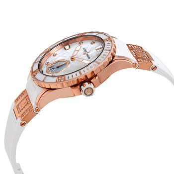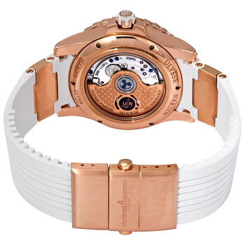 18kt rose gold case with a white rubber strap. Uni-directional rotating rubberized bezel. White mother of pearl dial with rose gold-tone hands and diamonds hour markers. Dial Type: Analog. Date display at the 6 o'clock position. Ulysse Nardin Calibre UN-320 automatic movement. Scratch resistant sapphire crystal. Screw down crown. Round case shape. Case size: 40 mm. Deployment clasp. Water resistant at 300 meters / 1000 feet. Functions: date, hour, minute, second. Additional Info: set with 80 diamonds. Luxury watch style. Watch label: Swiss Made. Ulysse Nardin Diver 18kt Rose Gold White Mother of Pearl Diamond Dial Automatic Ladies Watch 3202-190-3C/10.10.