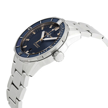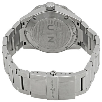 Silver-tone stainless steel case with a silver-tone stainless steel bracelet. Inverted concave uni-directional rotating blue stainless steel bezel. Blue dial with silver-tone hands and index hour markers. Minute markers around the outer rim. Dial Type: Analog. Luminescent hands and markers. Date display at the 6 o'clock position. Ulysse Nardin Calibre UN-816 automatic movement with a 42-hour power reserve. Scratch resistant sapphire crystal. Screw down crown. Solid case back. Round case shape. Case size: 42 mm. Deployment with push button release clasp. Water resistant at 300 meters / 1000 feet. Functions: date, hour, minute, second. Dive watch style. Watch label: Swiss Made. Ulysse Nardin Diver Automatic Blue Dial Men's Watch 8163-175-7M/93.