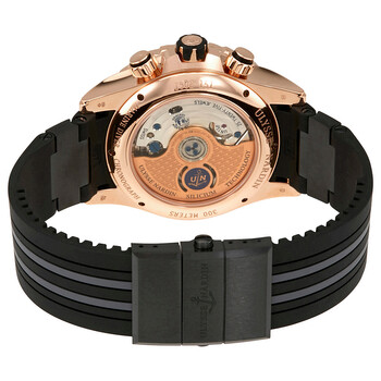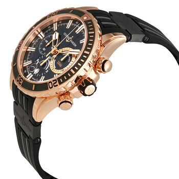 18 carat rose gold case with a black rubber strap. Uni-directional rotating bezel. Black dial with rose gold-tone hands and index hour markers. Tachymeter. Dial Type: Analog. Luminescent hands and markers. Date display at the 6 o'clock position. Chronograph - three sub-dials displaying: 60 second, 30 minute and 12 hours. Ulysse Nardin Calibre UN-150 automatic movement. Scratch resistant sapphire crystal. Case size: 44 mm. Round case shape. Water resistant at 300 meters / 1000 feet. Functions: chronograph, date, hour, minute, second. Luxury watch style. Watch label: Swiss Made. Ulysse Nardin Diver Automatic Men's Chronograph Watch 1502-151-3C/92.