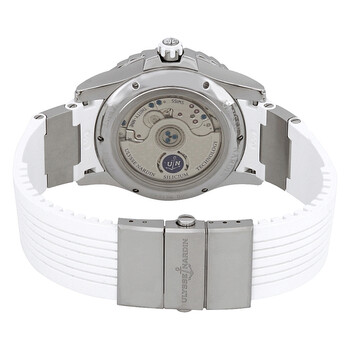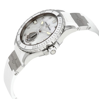 Silver-tone stainless steel case with a white rubber strap with titanium elements. Uni-directional rotating stainless steel bezel with a white rubber inlay. White mother of pearl dial with silver-tone hands and diamond hour markers. Dial Type: Analog. Luminescent hands and markers. Date display at the 6 o'clock position. Small seconds sub-dials Ulysse Nardin calibre UN-320 automatic movement with a 48-hour power reserve. Scratch resistant sapphire crystal. Screw down crown. Case size: 40 mm. Round case shape. Deployment clasp. Water resistant at 300 meters / 1000 feet. Functions: date, hour, minute, second. Luxury watch style. Watch label: Swiss Made. Ulysse Nardin Diver Automatic Mother of Pearl Diamond Dial Ladies Watch 3203-190-3/10.