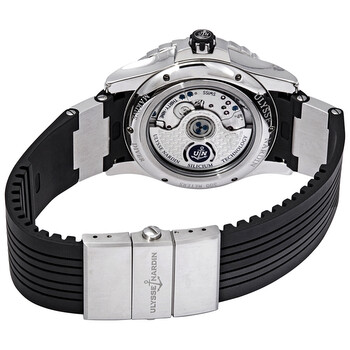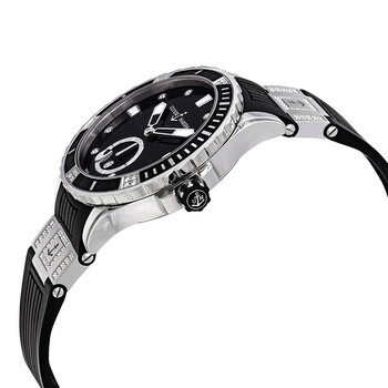 Stainless steel case with a black rubber strap. Uni-directional rotating black rubberized bezel. Black dial with silver-tone hands and diamonds hour markers. Dial Type: Analog. Date display at the 6 o'clock position. Ulysse Nardin Calibre UN-320 automatic movement. Scratch resistant sapphire crystal. Screw down crown. Round case shape. Case size: 40 mm. Deployment clasp. Water resistant at 300 meters / 1000 feet. Functions: date, hour, minute, second. Additional Info: set with 80 diamonds. Luxury watch style. Watch label: Swiss Made. Ulysse Nardin Diver Black Diamond Dial Automatic Ladies Watch 3203-190-3C/12.12.