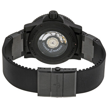 Black rubber covered stainless steel case with a black rubber strap with black ceramic elements. Uni-directional rotating black rubber covered stainless steel bezel with yellow ceramic baguette inserts. Black skeleton dial with luminous grey hands and index hour markers. Minute markers around the outer rim. Dial Type: Analog. Luminescent hands and markers. Date display at the 6 o'clock position. Two sub-dials displaying: 60 second and power reserve. Ulysse Nardin calibre UN-26 hand wind movement with a 42-hour power reserve. Scratch resistant sapphire crystal. Screw down crown. Transparent case back. Round case shape. Case size: 45.8 mm. Band width: 22 mm. Push button clasp. Water resistant at 200 meters / 660 feet. Functions: date, hour, minute, second, power reserve indicator, chronometer. Luxury watch style. Watch label: Swiss Made. Ulysse Nardin Diver Black Sea Automatic Black Dial Men's Watch 263-92B4-3C/924.