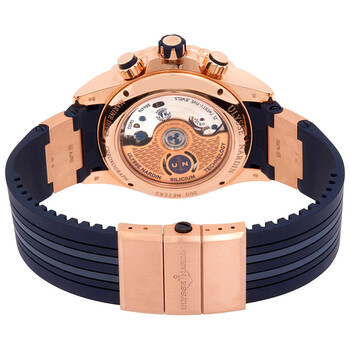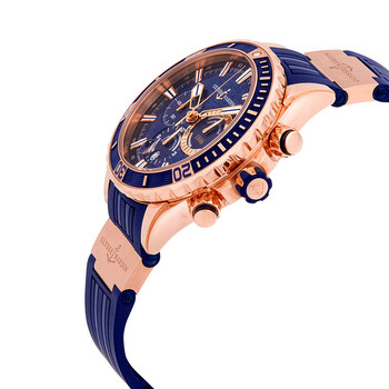 Rose gold-tone 18 carat rose gold case with a blue riubber bracelet. Uni-directional rotating blue 18 carat rose gold bezel. Blue dial with rose gold-tone hands and index hour markers. Tachymeter. Dial Type: Analog. Luminescent hands and markers. Date display at the 6 o'clock position. Chronograph - three sub-dials displaying: 60 second, 30 minute and 12 hours. Ulysse Nardin Calibre UN-150 automatic movement with a 48 power reserve. Scratch resistant sapphire crystal. Case size: 44 mm. Round case shape. Water resistant at 300 meters / 1000 feet. Functions: chronograph, date, hour, minute, second. Luxury watch style. Watch label: Swiss Made. Ulysse Nardin Diver Blue Dial Automatic Men's Chronograph 18K Rose Gold Watch 1502-151-3/93.