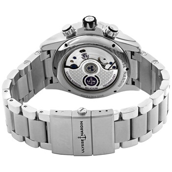 Silver-tone stainless steel case with a silver-tone stainless steel bracelet. Uni-directional rotating black stainless steel with a rubber inlay bezel. Black dial with lumunous silver-tone hands and index hour markers. Minute markers. tachymeter markings around the outer rim. Dial Type: Analog. Luminescent hands and markers. Date display at the 5 o'clock position. Chronograph - three sub-dials displaying: 60 second, 30 minute and 12 hour. Caliber UN-150 automatic movement with a 48-hour power reserve. Scratch resistant sapphire crystal. Screw down crown. Transparent case back. Round case shape. Case size: 44 mm. Fold over with safety release clasp. Water resistant at 300 meters / 1000 feet. Functions: chronograph, tachymeter, date, hour, minute, second. Luxury watch style. Watch label: Swiss Made. Ulysse Nardin Diver Chronograph Automatic Black Dial Men's Watch 1503-151-7M/92.