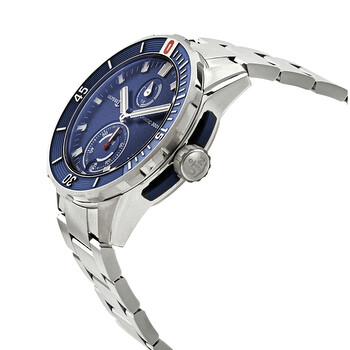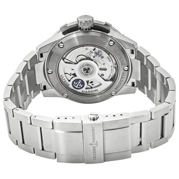 Grey titanium case with a grey titanium bracelet. Uni-directional rotating titanium bezel with a blue ring bezel. Blue dial with luminous silver-tone hands and index hour markers. Minute markers around the outer rim. Dial Type: Analog. Luminescent hands and markers. Date display at the 6 o'clock position. Two displays showing: small seconds and power reserve. Ulysse Nardin calibre UN-118 automatic movement, based upon Ulysse Nardin UN-66, containing 50 Jewels, bitting at 28800 vph, and has a power reserve of approximately 60 hours. Scratch resistant sapphire crystal. Screw down crown. Transparent case back. Round case shape. Case size: 44 mm. Case thickness: 13.10 mm. Band width: 24 mm. Deployment clasp. Water resistant at 300 meters / 1000 feet. Functions: date, hour, minute, second. Luxury watch style. Watch label: Swiss Made. Ulysse Nardin Diver Chronometer Automatic Blue Dial Men's Watch 1183-170-7M/93.
