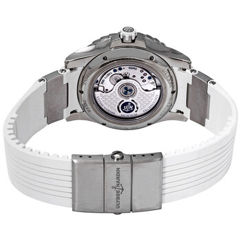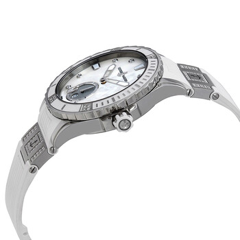 Silver-tone stainless steel case with a white rubber strap. Uni-directional rotating rubberized bezel. Mother of pearl dial with diamonds hour markers. Dial Type: Analog. Date display at the 6 o'clock position. Ulysse Nardin Calibre UN-320 automatic movement. Scratch resistant sapphire crystal. Screw down crown. Round case shape. Case size: 40 mm. Deployment clasp. Water resistant at 300 meters / 1000 feet. Functions: date, hour, minute, second. Additional Info: set with 80 diamonds. Luxury watch style. Watch label: Swiss Made. Ulysse Nardin Diver Mother of Pearl Diamond Dial Automatic Ladies Watch 3203-190-3C/10.10.