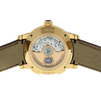 Rose gold-tone 18kt rose gold case with a brown crocodile leather strap. Fixed rose gold-tone 18kt rose gold bezel. Brown dial with rose gold-tone hands and index hour markers. Minute markers around the outer rim. Dial Type: Analog. Date display at the 2 o'clock position. Ulysse Nardin Calibre UN-334 Automatic movement, containing 49 Jewels, bitting at 28800 vph, and has a power reserve of approximately 48 hours. Scratch resistant sapphire crystal. Transparent see through case back. Round case shape, case size: 42 mm. Water resistant at 30 meters / 100 feet. Functions: GMT, second time zone, date, hour, minute, second. Dual Time 3346-126-bg Series. Luxury watch style. Watch label: Swiss Made. Ulysse Nardin Dual Time 3346-126-BG Automatic Brown Dial Men's Watch 3346-126LE/BQ.