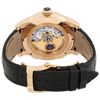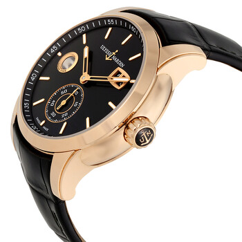18kt rose gold case with a black alligator leather strap. Fixed 18kt rose gold bezel. Black dial with luminous rose gold-tone hands and index hour markers. Minute markers around the outer rim. Dial Type: Analog. Luminescent hands and markers. Date display at the 1 o'clock position. Small seconds sub-dial at the 6 o'clock position. Dual time display appears at the 9 o'clock position. Automatic movement with a 48-hour power reserve. Scratch resistant sapphire crystal. Screw down crown. Transparent case back. Case diameter: 42 mm. Round case shape. Deployant clasp. Water resistant at 100 meters / 330 feet. Functions: GMT, second time zone, hour, minute, second. Luxury watch style. Watch label: Swiss Made. Ulysse Nardin Dual Time Black Dial 18kt Rose Gold Men's Watch 3346-126-92.