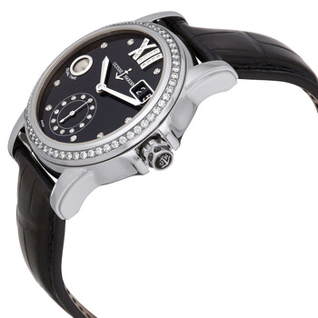 Stainless steel case with a black leather strap. Fixed bezel set with diamonds bezel. Black dial with silver-toned hands and diamond hour markers. Dial Type: Analog. Date display at the 2 o'clock position. Diamond accented small seconds sub-dial subdials. Ulysse Nardin Calibre UN-334 automatic movement with a 48-hour power reserve. Scratch resistant sapphire crystal. Round case shape. Case size: 37.5 mm. Deployment clasp. Water resistant at 50 meters / 165 feet. Functions: GMT, second time zone, date, hour, minute, second. Additional Info: dual time window at the 9 o'clock position. Luxury watch style. Watch label: Swiss Made. Ulysse Nardin Dual Time Black Dial Diamond Automatic Ladies Watch 3343-222B-30-02.