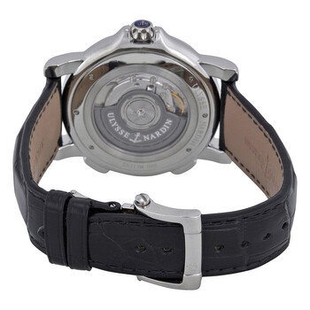 Silver-tone stainless steel case with a black leather strap. Fixed silver-tone stainless steel bezel. Black dial with luminous hands and index hour markers. Arabic numerals mark the 6 and 12 o'clock positions. Minute markers around the outer rim. Dial Type: Analog. Luminescent hands and markers. Date display at the 2 o'clock position. One subdial displaying: small second above the 6 o'clock position. second time zone at the 9 o'clock position. Ulysse Nardin Calibre UN-24 Automatic movement, containing 34 Jewels, bitting at 28800 vph, and has a power reserve of approximately 42 hours. Scratch resistant sapphire crystal. Screw down crown. Transparent case back. Round case shape, case size: 42 mm, case thickness: 12 mm. Band width: 22 mm. Water resistant at 100 meters / 330 feet. Functions: GMT, second time zone, date, hour, minute, second. Dual Time Series. Luxury watch style. Watch label: Swiss Made. Item Variations: 243 55 62, 243.55.62, 2435562. Ulysse Nardin Dual Time Men's Watch 243-55-62.