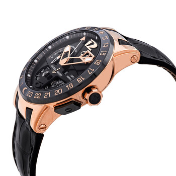 18kt rose gold case with a black alligator leather strap. Fixed black ceramic displaying 24 hour markings bezel. Black dial with luminous skeleton hands and index hour markers. Arabic numerals mark the 6 and 12 o'clock positions. minute markers around the outer rim. Dial Type: Analog. Luminescent hands and markers. Perpetual calendar. day of the week and month display at center dial. two digit year above 6 o'clock position. One - small second subdial. Ulysse Nardin Calibre UN-32 Automatic movement, containing 34 Jewels, bitting at 28800 vph, and has a power reserve of approximately 48 hours. Scratch resistant sapphire crystal. Screw down crown. Transparent case back. Round case shape, case size: 43 mm, case thickness: 15 mm. Band width: 25 mm. Fold over with push button release clasp. Water resistant at 100 meters / 330 feet. Functions: year, month, date, day, hour, minute, second, GMT, second time zone, chronometer, perpetual calendar. El Toro Gmt Series. Luxury watch style. Watch label: Swiss Made. Ulysse Nardin El Toro GMT Black Dial 18kt Rose Gold Black Leather Men's Watch 326-03.