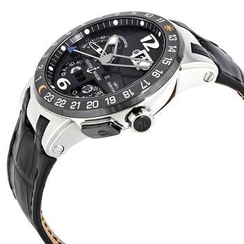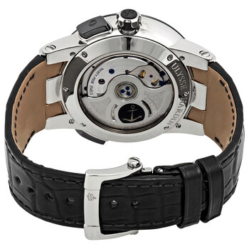 18kt white gold case with a black (alligator) leather strap. Black ceramic bezel showing 24 hour markers. Black dial with luminous silver-tone hands and index hour markers. Arabic numerals mark the 6 and 12 o'clock positions. Minute markers around the outer rim. Dial Type: Analog. Luminescent hands and markers. Perpetual calendar. Small seconds sub-dial. GMT dual time zone display. Ulysse Nardin calibre UN-32 automatic movement with a 48-hour power reserve. Scratch resistant sapphire crystal. Screw down crown. Transparent case back. Round case shape. Case size: 43 mm. 18kt white gold deployment clasp. Water resistant at 100 meters / 330 feet. Functions: perpetual calendar, GMT, second time zone, year, month, date, day, hour, minute, second, chronometer. Luxury watch style. Watch label: Swiss Made. Item Variations: 320 00, 320.00, 32000. Ulysse Nardin El Toro Perpetual Automatic Men's Watch 320-00.