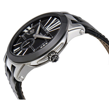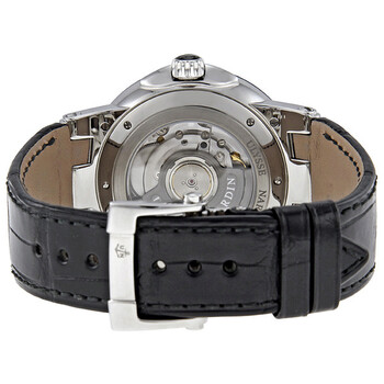 Stainless steel case with a black leather strap. Fixed black ceramic bezel. Black dial with luminous silver-tone hands and index hour markers. Roman numerals appear at the 3, 6, 9 and 12 o'clock positions. Minute markers around an inner ring. Dial Type: Analog. Luminescent hands and markers. Date display apepars at the 2 o'clock position. Small seconds sub-dial. Dual time zone display at the 9 o'clock position. Ulysse Nardin calibre UN-24 automatic movement, containing 34 Jewels, bitting at 28800 vph, and has a power reserve of approximately 42 hours. Scratch resistant sapphire crystal. Screw down crown. Transparent case back. Round case shape, case size: 43 mm, case thickness: 12.6 mm. Band width: 25 mm. Tang clasp. Water resistant at 100 meters / 330 feet. Functions: GMT, second time zone, date, hour, minute, second. Executive Dual Time Series. Luxury watch style. Watch label: Swiss Made. Ulysse Nardin Executive Dual Time Automatic Black Leather Men's Watch 243-00-42.