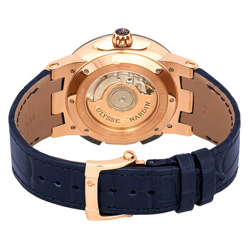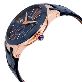 18kt rose gold case with a blue alligator leather strap. Fixed blue ceramic top ring bezel. Blue dial with luminous rose gold hands and index hour markers. Roman nunerals mark the 3, 6, 9 and 12 o'clock positions. Dial Type: Analog. Luminescent hands. Date display at the 2 o'clock position. One subdial displaying: small second. Ulysse Nardin Calibre UN-24 Automatic movement, containing 34 Jewels, bitting at 28800 vph, and has a power reserve of approximately 42 hours. Scratch resistant sapphire crystal. Screw down crown. Transparent case back. Round case shape, case size: 43 mm, case thickness: 12.6 mm. Band width: 24 mm. Deployment clasp. Water resistant at 100 meters / 330 feet. Functions: GMT, second time zone, hour, minute, second. Executive Dual Time Series. Luxury watch style. Watch label: Swiss Made. Ulysse Nardin Executive Dual Time Automatic Blue Dial Men's Watch 246-00/43.