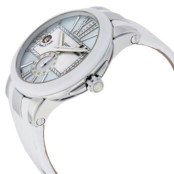 Silver-tone stainless steel case with a white leather strap. Fixed white ceramic bezel. Mother of pearl dial with luminous silver-tone hands and index hour markers. Diamond-filled roman numeral hour markers. Dial Type: Analog. Luminescent hands. Date display at the 2 o'clock position. One subdial displaying: small second. Ulysse Nardin Calibre UN-24 Automatic movement, containing 34 Jewels, bitting at 28800 vph, and has a power reserve of approximately 42 hours. Scratch resistant sapphire crystal. Screw down crown. Transparent case back. Round case shape, case size: 40 mm, case thickness: 12.8 mm. Band width: 25 mm. Fold over with push button release clasp. Water resistant at 50 meters / 165 feet. Functions: GMT, second time zone, date, hour, minute, second. Executive Dual Time Series. Luxury watch style. Watch label: Swiss Made. Ulysse Nardin Executive Dual Time Automatic Ladies Watch 243-10/391.