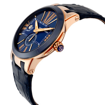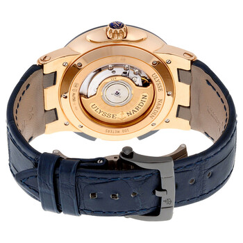 18kt rose gold case with a blue (alligator) leather strap. Fixed blue ceramic bezel. Blue dial with luminous rose gold hands and index hour markers. Roman numerals mark the 3, 6, 9 and 12 o'clock positions. Minute markers around the inner ring. Dial Type: Analog. Luminescent hands. Date display at the 1 o'clock position. Dual time display into a 9 o'clock position. Small seconds sub-dial at the 6 o'clock position. Automatic movement with a 42 hour power reserve. Scratch resistant sapphire crystal. Screw down crown. Skeleton case back. Case diameter: 43 mm. Case thickness: 12.6 mm. Round case shape. Strap width: 20 mm. Tang clasp. Water resistant at 100 meters / 330 feet. Functions: date, hour, minute, second, GMT dual time. Luxury watch style. Watch label: Swiss Made. Ulysse Nardin Executive Dual Time Automatic Blue Dial 18kt Rose Gold Men's Watch 246-00-5-43.