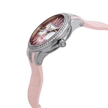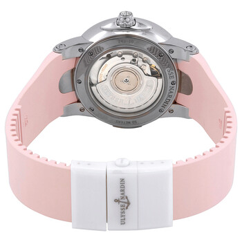 Stainless steel case with a pink rubber strap. Fixed-diamond set stainless steel bezel. Pink mother of pearl dial with silver-tone hands and index-Roman numerals hour markers. Dial Type: Analog. Luminescent hands. Date display at the 2 o'clock position. One- 60 seconds subdials. Ulysse Nardin Calibre UN-24 automatic movement with a 42-hour power reserve. Scratch resistant sapphire crystal. Pull / push crown. Transparent case back. Round case shape, case size: 40 mm, case thickness: 12.8 mm. Fold over with safety release clasp. Water resistant at 50 meters / 165 feet. Functions: GMT, second time zone, hour, minute, second, date. Luxury watch style. Watch label: Swiss Made. Item Variations: 243 10B 3C 397, 243.10B.3C.397, 24310B3C397. Ulysse Nardin Executive Dual Time Automatic Pink Mother Of Pearl Diamond Dial Ladies Rubber Watch 243-10B-3C-397.