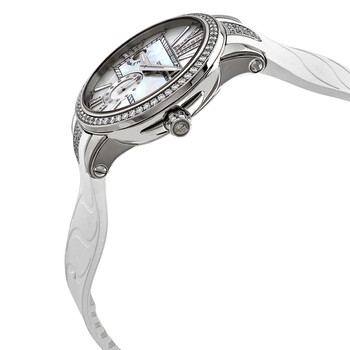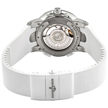 Stainless steel case with a white rubber strap. Fixed-diamond set stainless steel bezel. Mother of pearl dial with silver-tone hands and index-Roman numerals hour markers. Dial Type: Analog. Luminescent hands. Date display at the 2 o'clock position. One- 60 seconds subdials. Ulysse Nardin Calibre UN-24 automatic movement with a 42-hour power reserve. Scratch resistant sapphire crystal. Pull / push crown. Transparent case back. Round case shape, case size: 40 mm, case thickness: 12.8 mm. Fold over with safety release clasp. Water resistant at 50 meters / 165 feet. Functions: GMT, second time zone, hour, minute, second, date. Luxury watch style. Watch label: Swiss Made. Item Variations: 243 10B 3C 391, 243.10B.3C.391, 24310B3C391. Ulysse Nardin Executive Dual Time Automatic White Mother Of Pearl Diamond Dial Ladies Rubber Watch 243-10B-3C-391.