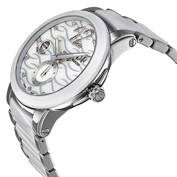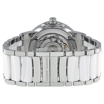 Stainless steel case with a stainless steel bracelet with white ceramic center links. Fixed white ceramic bezel. Mother of pearl dial with silver-tone hands and diamond hour markers. Diamond encrusted Arabic Numeral at the 12 o'clock position. Dial Type: Analog. Luminescent hands. Date display appears at the 2 o'clock position. Seconds sub-dial above the 6 o'clock position. Dual time display at ther 3 o'clock position. Automatic movement with a 42-hour power reserve. Scratch resistant sapphire crystal. Pull / push crown. Skeleton case back. Case diameter: 40 mm. Case thickness: 12.8 mm. Round case shape. Band width: 24 mm. Band length: 7 inches. Fold over clasp with a safety release. Water resistant at 50 meters / 165 feet. Functions: GMT, second time zone, date, hour, minute, second. Additional Info: dual time appears at the 9 o'clock position. Luxury watch style. Watch label: Swiss Made. Ulysse Nardin Executive Dual Time Diamond Mother of Pearl Ceramic Ladies Watch 243-10-7-691.