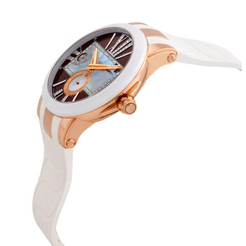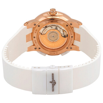 18kt rose gold case with a white rubber strap. Fixed white ceramic bezel. Brown (mother of pearl) dial with luminous rose gold hands and index hour markers. Roman numerals mark the 3, 6, 9 and 12 o'clock positions. Dial Type: Analog. Luminescent hands and markers. Date display at the 2 o'clock position. Diamond-set small seconds sub-dial. Dual time display at the 9 o'clock position. Ulysse Nardin calibre UN-24 automatic movement, containing 34 Jewels, bitting at 28800 vph, and has a power reserve of approximately 42 hours. Scratch resistant anti-reflective sapphire crystal. Pull / push crown. Transparent case back. Round case shape. Case size: 40 mm. Case thickness: 12.8 mm. Band width: 20 mm. Deployment clasp. Water resistant at 50 meters / 165 feet. Functions: GMT, second time zone, date, hour, minute, second. Executive Dual Time Series. Dress watch style. Watch label: Swiss Made. Item Variations: 246 10 3 30 05, 246.10.3.30.05, 2461033005. Ulysse Nardin Executive Dual Time Lady 18kt Rose Gold and Ceramic Brown Dial Rubber Strap Automatic Ladies Watch 246-10-3-30-05.