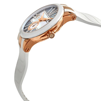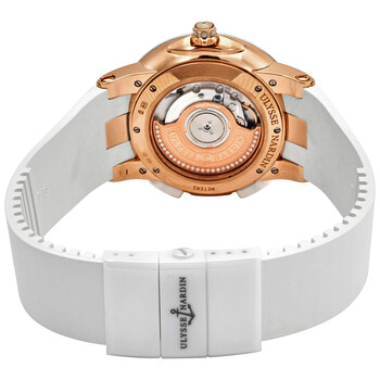 Rose gold and ceramic case with a white rubber strap. Fixed bezel. Grey mother of pearl dial with rose gold-tone hands and Roman numeral and indices hour markers. Dial Type: Analog. Luminescent hands and markers. Date display at the 2 o'clock position. Ulysse Nardin Calibre UN-24 automatic movement with a 42-hour power reserve. Scratch resistant sapphire crystal. Pull / push crown. Skeleton transparent exhibition see through case back. Round case shape, case size: 40 mm, case thickness: 12.8 mm. Deployment clasp. Water resistant at 50 meters / 165 feet. Functions: GMT, second time zone, date, hour, minute, second. Casual watch style. Watch label: Swiss Made. Item Variations: 246 10 3 392, 246.10.3.392, 246103392. Ulysse Nardin Executive Dual Time Lady Grey Mother Of Pearl Dial Rubber Strap Automatic Ladies Watch 246-10-3-392.