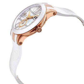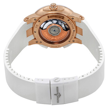 18kt rose gold case with a white rubber strap. Fixed white ceramic bezel. Mother of pearl dial with rose gold hands and index hour markers. Diamond-set roman numerals at the 3, 6, 9 and 12 o'clock positions. Dial Type: Analog. Luminescent hands and markers. Date display at the 2 o'clock position. Dual time. diamond-set seconds subdials. Ulysse Nardin Calibre UN-24 automatic movement with a 42-hour power reserve. Scratch resistant sapphire crystal. Pull / push crown. Transparent case back. Round case shape, case size: 40 mm, case thickness: 12.8 mm. Band width: 15 mm, band length: 7 inches. Deployment clasp. Water resistant at 50 meters / 165 feet. Functions: GMT, second time zone, date, hour, minute, second. Luxury watch style. Watch label: Swiss Made. Item Variations: 246 10 3 391, 246.10.3.391, 246103391. Ulysse Nardin Executive Dual Time Lady Mother of Pearl Dial Rubber Strap Automatic Ladies Watch 246-10-3-391.