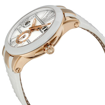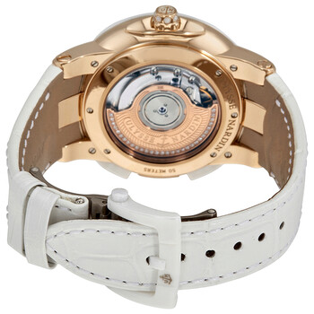 18kt rose gold case with a white leather strap. Fixed white ceramic bezel. White mother of pearl dial with rose gold-tone hands and index hour markers. Diamond-set roman numerals mark the 3, 6, 9 and 12 o'clock positions. Minute markers. Dial Type: Analog. Date display at the 2 o'clock position. One subdial displaying: small second. Ulysse Nardin Calibre UN-24 Automatic movement, containing 34 Jewels, bitting at 28800 vph, and has a power reserve of approximately 42 hours. Scratch resistant sapphire crystal. Pull / push crown. Transparent case back. Round case shape, case size: 40 mm, case thickness: 12.8 mm. Band width: 23 mm. Deployment clasp. Water resistant at 50 meters / 165 feet. Functions: GMT, second time zone, date, hour, minute, second. Additional Info: suitable for swimming and showering. Executive Dual Time Series. Luxury watch style. Watch label: Swiss Made. Ulysse Nardin Executive Dual Time Mother of Pearl Diamond Dial 18kt Rose Gold White Leather Ladies Watch 246-10-391.