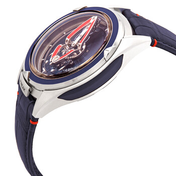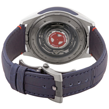 Silver-tone platinum case with a blue crocodile leather strap. Fixed silver-tone platinum bezel. White dial with index hour markers. Dial Type: Analog. Ulysse Nardin Calibre UN-250 automatic movement. Transparent case back. Round case shape. Case size: 45 mm. Buckle clasp. Water resistant at 30 meters / 100 feet. Functions: tourbillon. Additional Info: limited edition 10 pieces. Luxury watch style. Watch label: Swiss Made. Ulysse Nardin Freak Vision Tourbillon Automatic White Dial Men's Watch 2505-250.