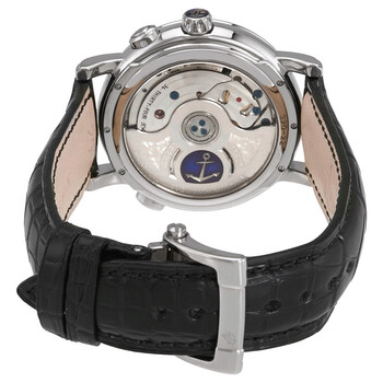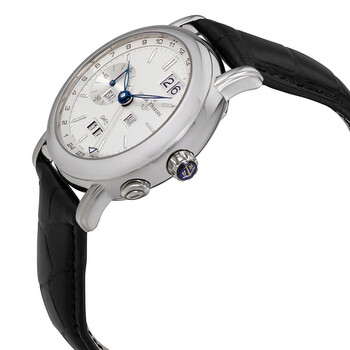 18kt white gold case with a black leather strap. Fixed bezel. Silver dial with luminous hands and index hour markers. Minute markers around the outer rim. Dial Type: Analog. Date display at the 1 o'clock position. Small seconds sub-dial. Automatic movement. Scratch resistant sapphire crystal. Pull / push crown. Case diameter: 38.5 mm. Case thickness: 12.5 mm. Round case shape. Deployant clasp. Functions: hour, minute, second, perpetual calendar. Luxury watch style. Watch label: Swiss Made. Ulysse Nardin GMT Perpetual Silver Dial 18kt White Gold Black Leather Men's Watch 320-22.