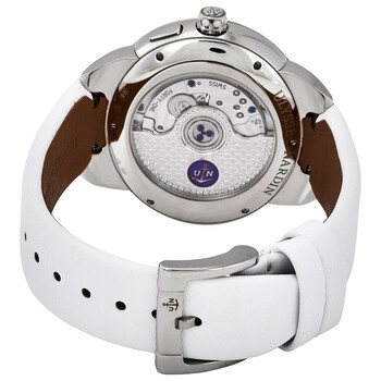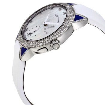 18kt white gold case with a white satin strap. Fixed 18kt white gold diamond set bezel. Mother of pearl dial with silver-tone hands and diamonds hour markers. Dial Type: Analog. Date display at the 6 o'clock position. Two- small seconds, power reserve subdials. Automatic movement with a 48-hour power reserve. Scratch resistant sapphire crystal. Transparent case back. Oval case shape. Case size: 36 x 39 mm. Buckle clasp. Water resistant at 30 meters / 100 feet. Functions: date, hour, minute, second. Luxury watch style. Watch label: Swiss Made. Ulysse Nardin Jade 18kt White Gold Mother of Pearl Diamond Dial Automatic Ladies White Satin Watch 3100-125BCLL/991.