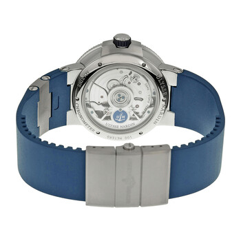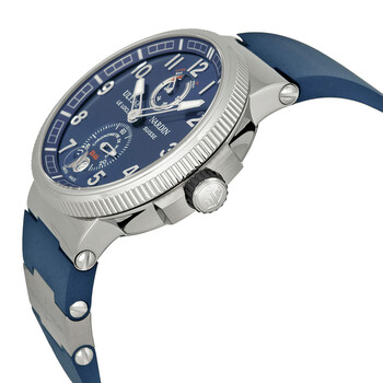 Silver-tone stainless steel case with a blue rubber with titanium elements strap. Fixed coin edge silver-tone stainless steel bezel. Navy blue dial with luminous silver-tone skeleton hands and Arabic numeral hour markers. Minute markers around the outer rim. Dial Type: Analog. Luminescent hands and markers. Date display at the 6 o'clock position. Two - 60 second and power reserve subdials. Ulysse Nardin Calibre UN-118 Automatic movement, based upon Ulysse Nardin UN-66, containing 50 Jewels, bitting at 28800 vph, and has a power reserve of approximately 60 hours. Scratch resistant sapphire crystal. Screw down crown. Transparent case back. Round case shape, case size: 43 mm, case thickness: 13.85 mm. Band width: 22 mm, band length: 8 inches. Fold over with push button release clasp. Water resistant at 100 meters / 330 feet. Functions: date, hour, minute, second, power reserve indicator, chronometer. Marine Series. Luxury watch style. Watch label: Swiss Made. Ulysse Nardin Marine Automatic Blue Dial Blue Rubber Men's Watch 1183-126-3-63.