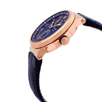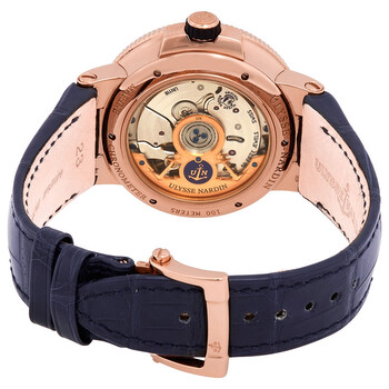 18kt rose gold case with a leather strap. Fixed coin edge 18kt rose gold bezel. Blue dial with rose gold-tone spade-shape hands and Roman numeral hour markers. Minute markers around the outer rim. Dial Type: Analog. Date display at the 6 o'clock position. Two - small second and power reserve indicator subdials. Ulysse Nardin Calibre UN-118 Automatic movement, based upon Ulysse Nardin UN-66, containing 50 Jewels, bitting at 28800 vph, and has a power reserve of approximately 60 hours. Scratch resistant sapphire crystal. Transparent case back. Round case shape, case size: 43 mm, case thickness: 13.85 mm. Band width: 22 mm. Water resistant at 100 meters / 330 feet. Functions: date, hour, minute, second, power reserve indicator, chronometer. Marine Series. Luxury watch style. Watch label: Swiss Made. Ulysse Nardin Marine Blue Dial Automatic Men's 18kt Rose Gold Watch 1186-126/43.